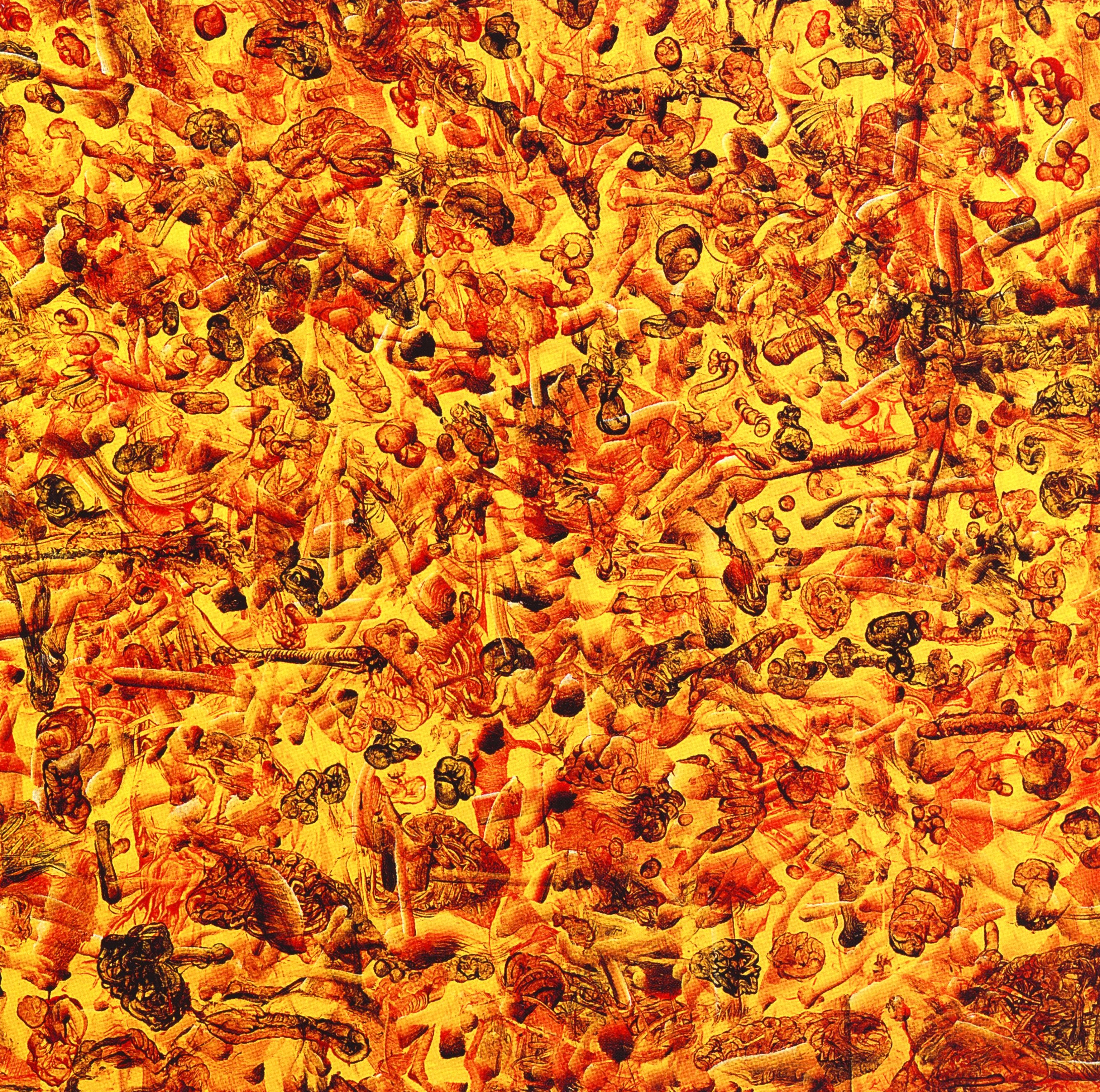 Titel: Alle meine Mitesser Jahr: 2002 Technik: Acryl auf Köper Größe: 200 x 200 cm Kategorien: 2002 - 2001, Malerei