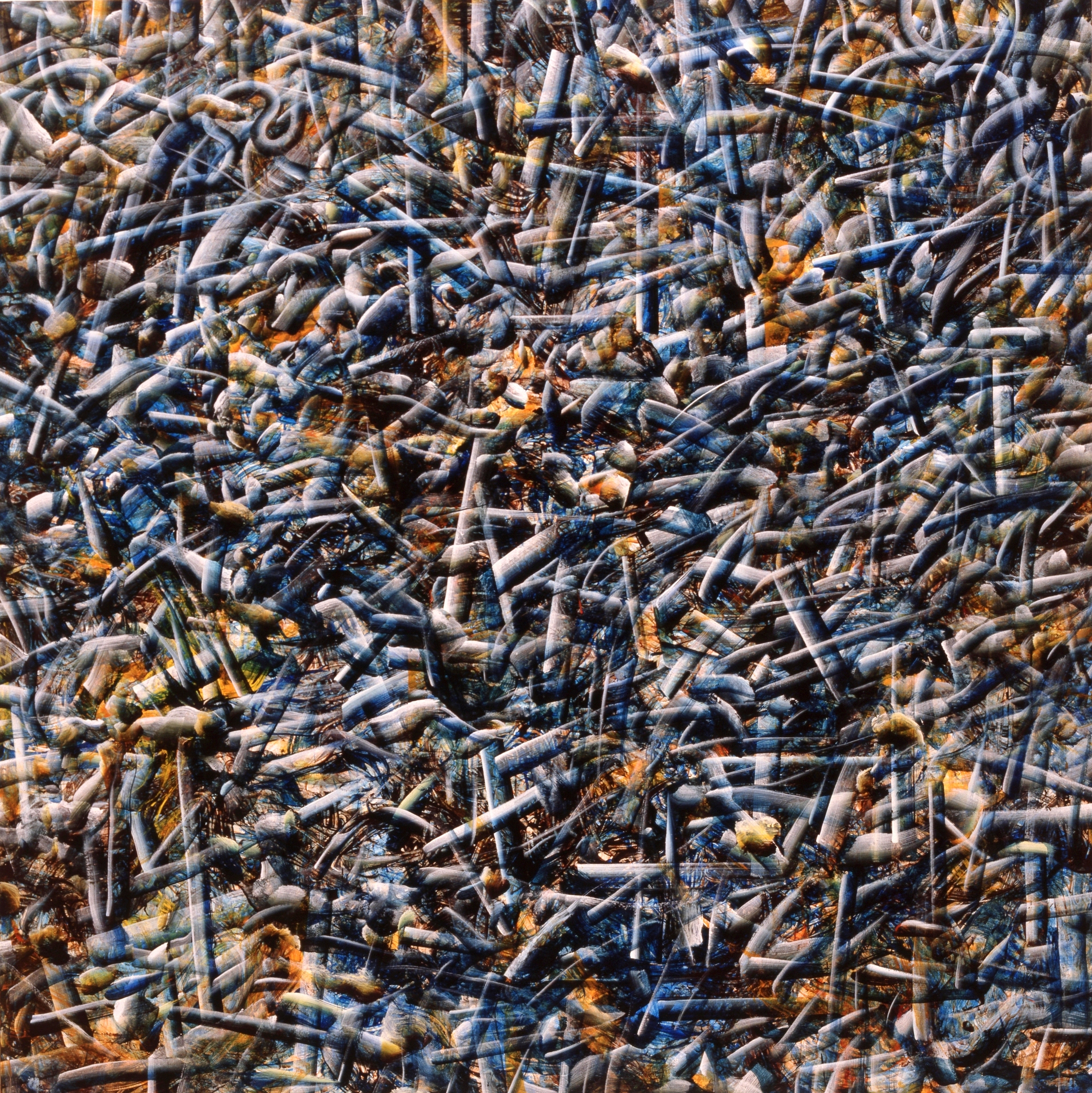 Titel: Berlins dunkle Vögel Jahr: 1997 Kategorien: 1996-1997, Malerei Technik: Acryl auf Köper Größe: 200 x 200 cm Untertitel: Berlins_dunkle_Vögel2