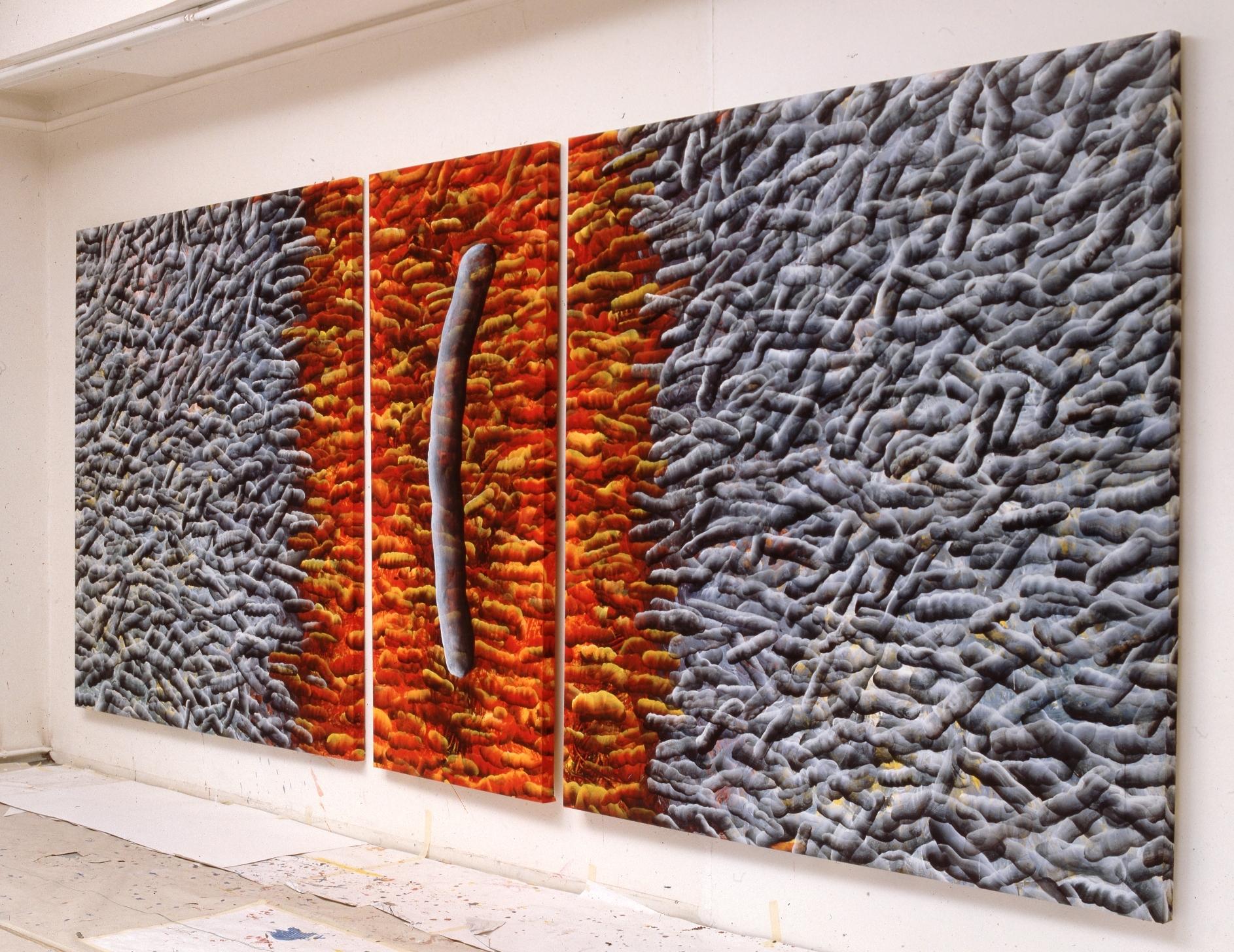 Titel: Schöne Scheiße (Triptychon) Jahr: 1997 Kategorien: 1996-1997, Malerei Technik: Acryl auf Köper Größe: 497 x 195 cm Untertitel: Schöne_Schei
